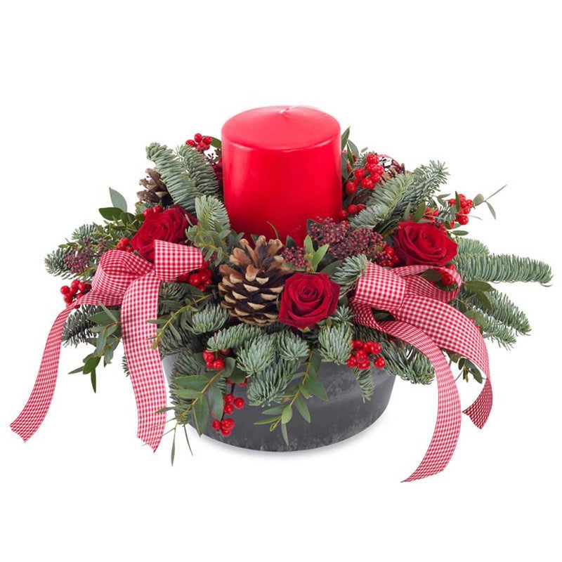 Podziel się radością Świąt! W skład „Kompozycji Mikołajkowej” wchodzą róże, gałązki świerkowe, szyszki oraz jarzębina. Całość uzupełnia dekoracyjna świeczka oraz wstążka. Aranżacja ułożona będzie przez lokalną kwiaciarnię Euroflorist. Istnieje do niej możliwość dołożenia bileciku ze świątecznymi życzeniami.